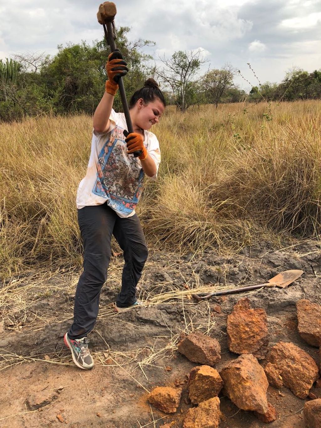 Mary taking out her anger on some rocks while repairing roads at the rhino sanctuary.
