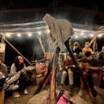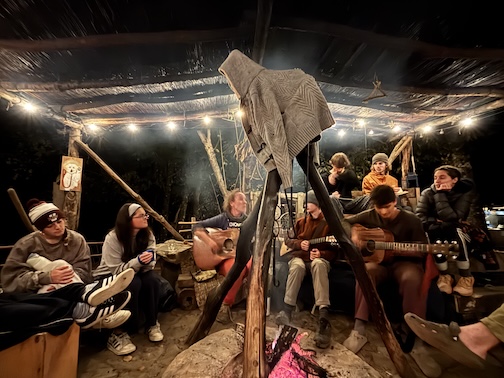 Playing music around the fire.