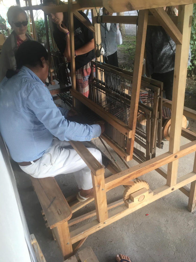 A host father shows us how his family weaves textiles using this machine.