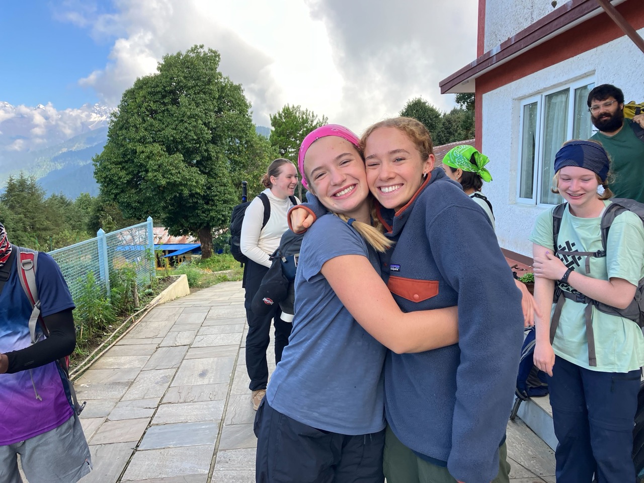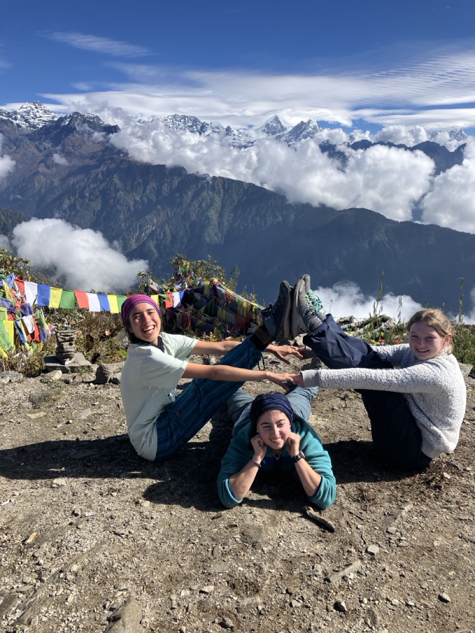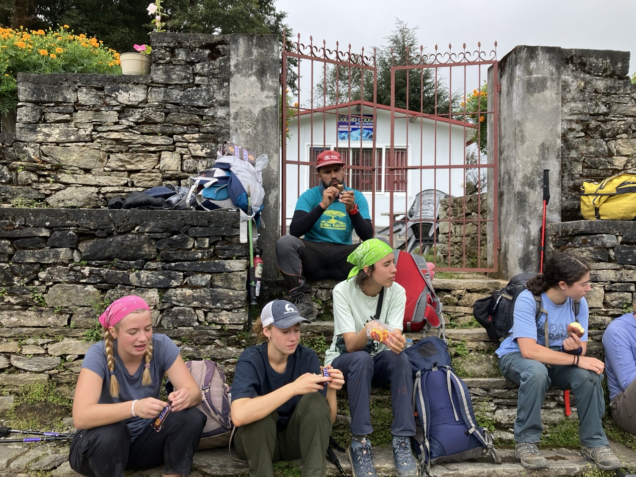 Last week, after saying goodbye to our friends from Conscious Impact, we departed on a three-hour jeep ride with our guides, Suvash and Sandesh, to the beginning of our trek. After a classic lunch of dal bhat and HUGE cucumbers, we embarked on our journey. The next five hours were spent questioning our life choices as we walked countless stairs up the mountain. Luckily, as the best leaders ever, we had stocked up on an abundance of cookies and apples. Unfortunately, Ava (the token celiac of the group) had eaten her apple two minutes after lunch so I (Sarah) had to give her mine. #leadermoment #instantregret. Eventually, we reached our destination, chowed down, and enjoyed the first hot showers we had had in weeks.