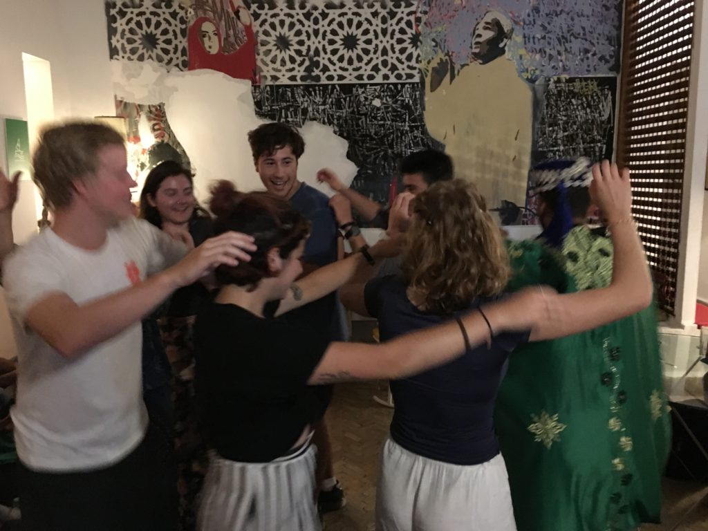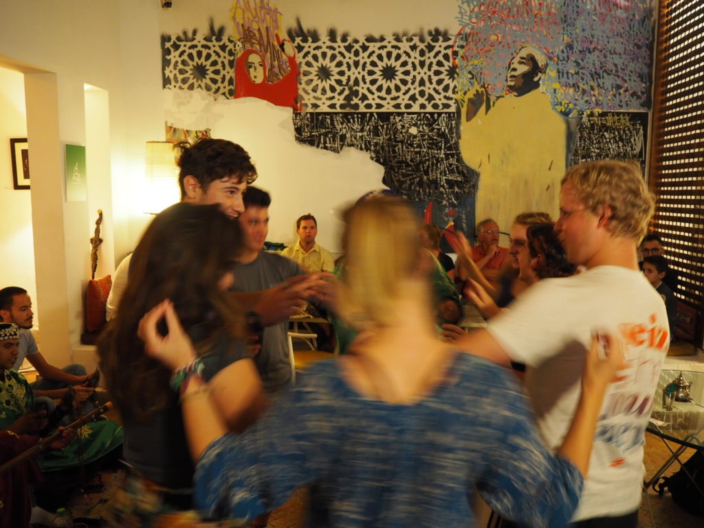 At a Gnawa show at Cafe Clock, an international restaurant in Marrakesh that hosts traditional Arabic music performance weekly.