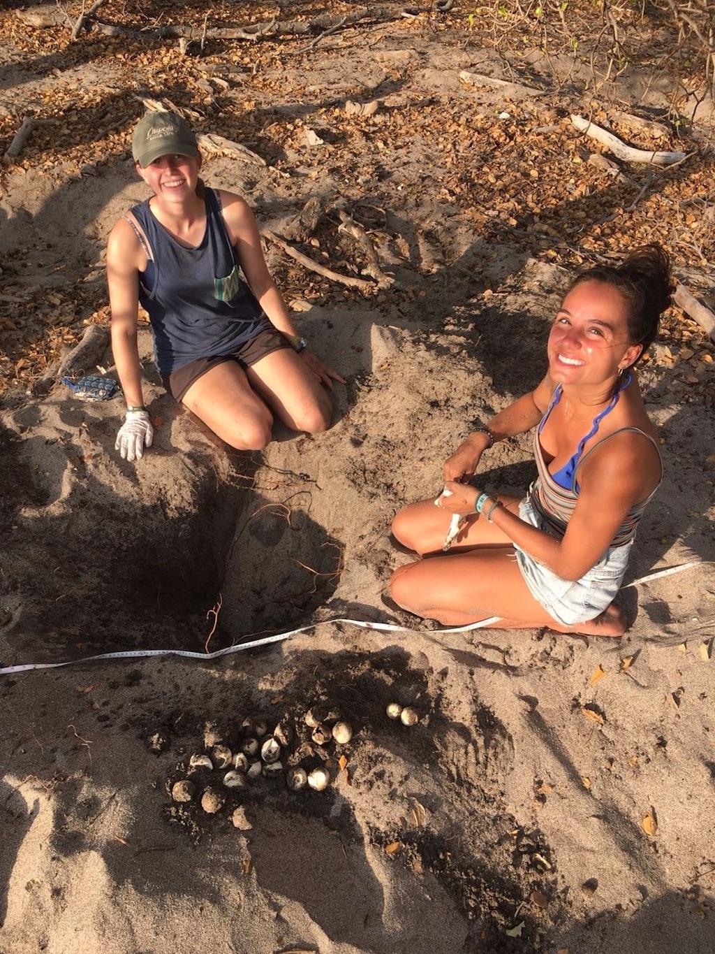 Patrols occurred in two shifts: 8-11 PM and 11PM-2AM. During a shift, we walked the beach looking for turtle tracks. If we located a turtle, the next step was to sit nearby and wait for the nest to be built — a process that typically takes at least 30 minutes. Turtles choose a spot to lay eggs far from the water to protect their nest from the tide. Once the turtle is prepared to lay eggs, we prepared to catch the eggs. It is important to take, relocate, and bury turtle eggs to protect them from being taken by poachers in the area. Both Grace and Juliette had the opportunity to catch the eggs from a turtle during the process. Following the egg laying, measurements of the turtle and her nest were taken before she returned to the ocean.