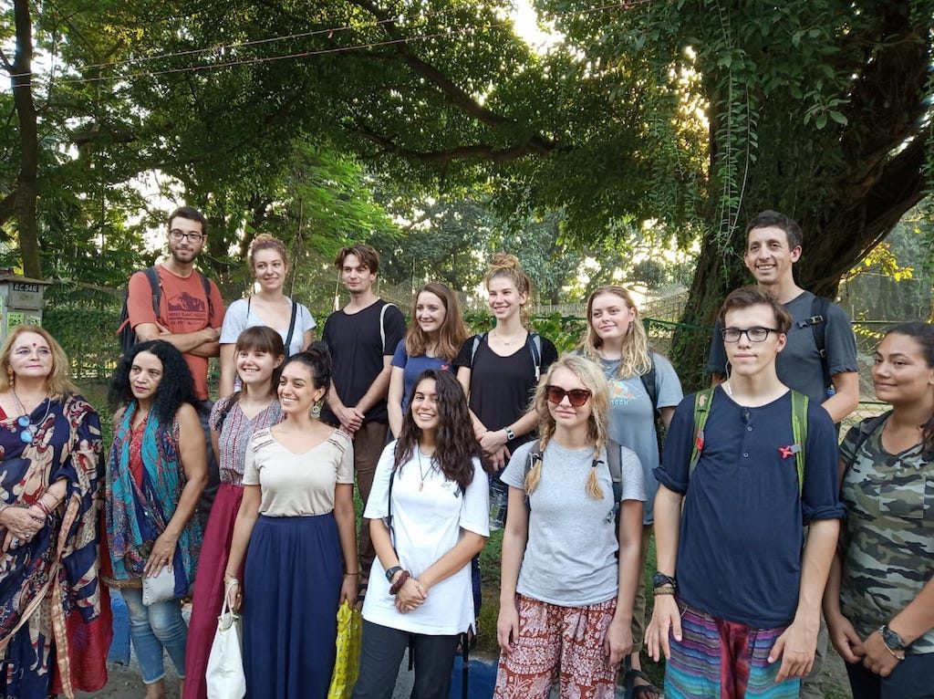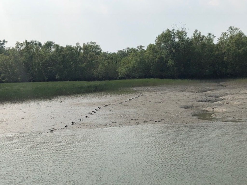 But before we got started on our work we took a 3 hour car ride and a 2 hour boat ride over to the Sundarbans for a river tour on Thursday. We spent Wednesday night in an eco-lodge right on a tributary river for the Bay of Bengal. I spent the night disposing of spiders for my roommates, none of us got very much sleep but we dragged ourselves out of bed at 6AM the next morning to get on the boat. Most of us relaxed and slept in the warm, humid air while waiting to see some spotted deer, birds, monkeys, and any signs that a tiger may have been there. Tigers are rarely seen my boat, they only come to the river to drink and are mostly active at night. With the heat i don’t blame them at all. During the day we stopped at a couple of watchpoints and saw some very tiny, very orange fiddler crabs and monitor lizards. On the boat we were lucky enough to spot lots of deer, egrets, and even a set of tiger tracks! We all ate on the boat and drank much chai. On the way back our bus got stuck in quite a bit of traffic because it was the second to last day of Durga Puja!